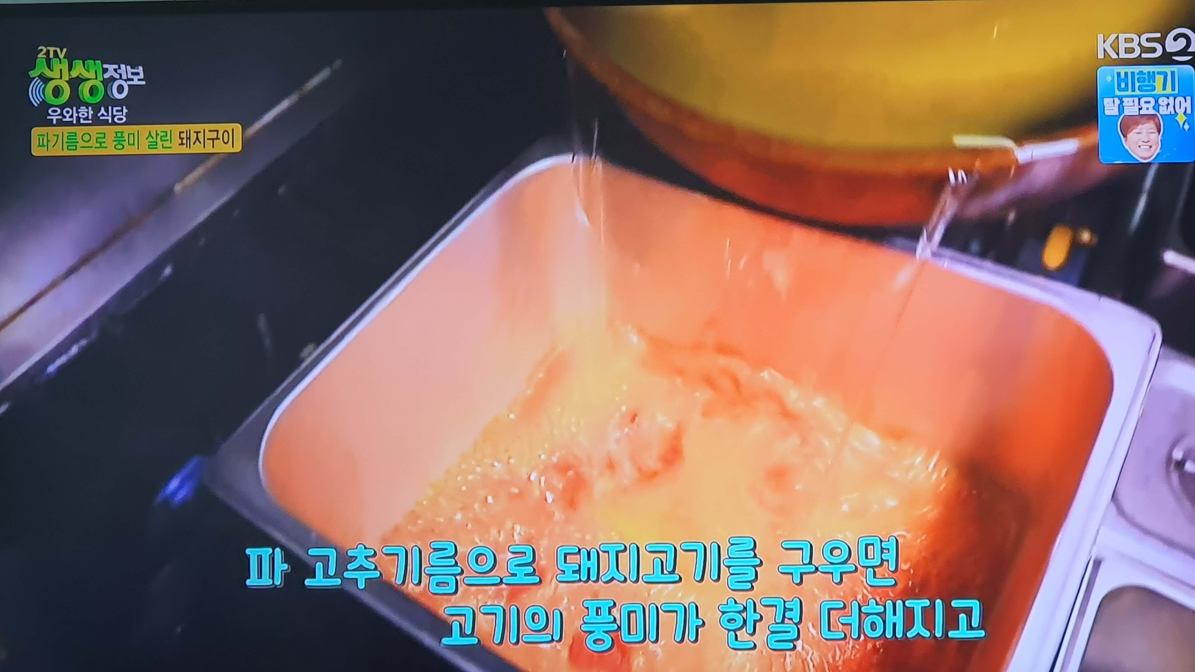 - 말린 파뿌리와 고춧가루를 섞은 고추기름으로 돼지 구워 풍미 업